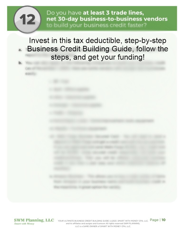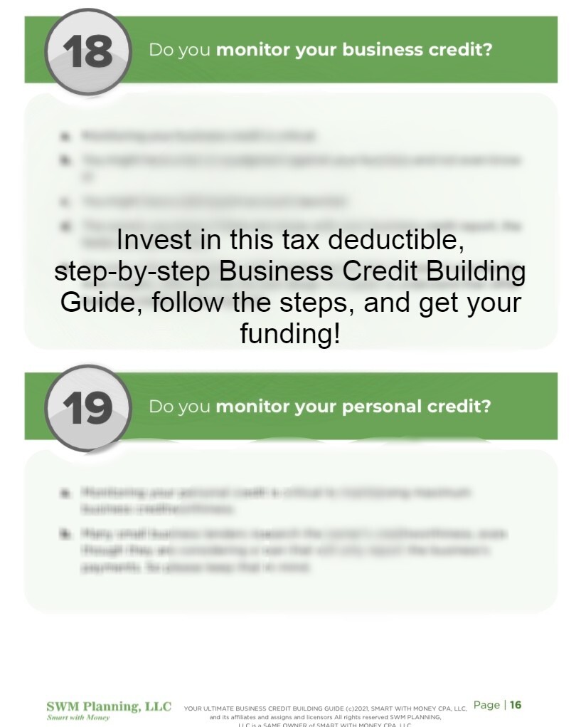 This bundle is for small business owners (and independent contractors) who want to build their business credit. You will receive a business credit building checklist with 20 items, over 15 pages of step-by-step business credit building guidance from a qualified, experienced Licensed CPA, and a coupon for $50 off CPA consulting services at SWM Planning, LLC.